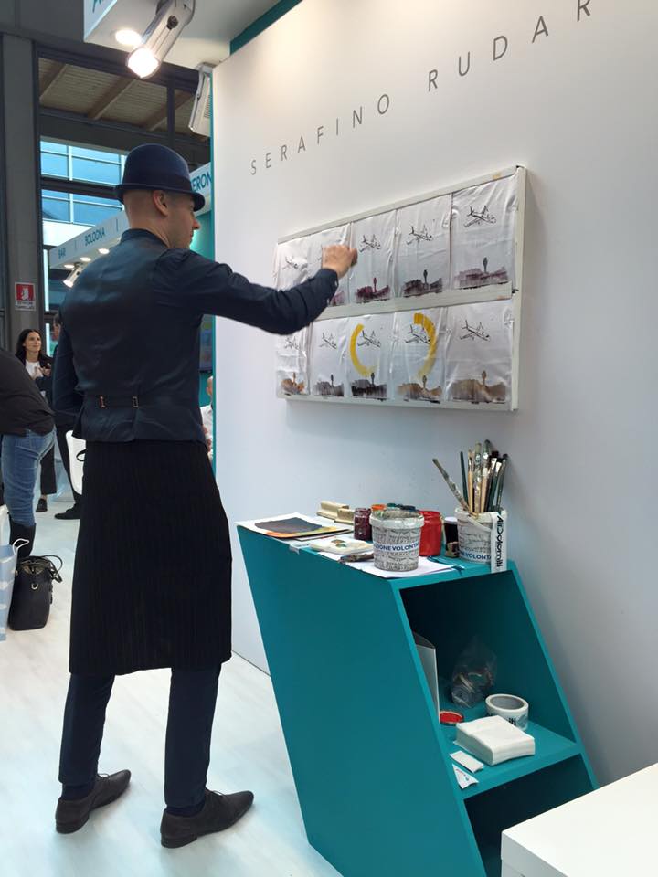 Le opere di Serafino Rudari allo stand Air Dolomiti, in questo caso al TTG di Rimini appena trascorso producevano in chiave aeronautica il volo e le sue impressioni artistiche a mano su magliette che si possono considerare ognuna un pezzo unico.