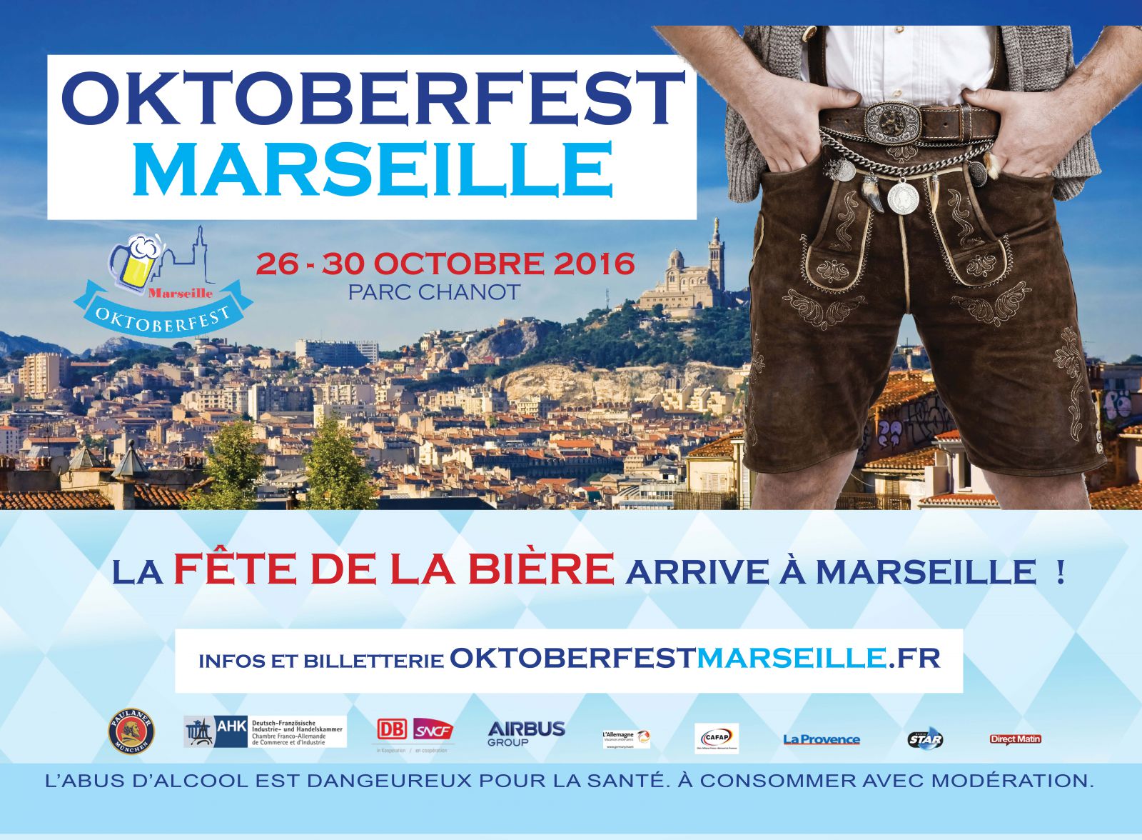 Dopo l’immenso successo dell’edizione 2015 a Parigi, che ha riunito più di 10.000 participanti e un centinaio di aziende, l’Oktoberfest arriva finalmente a Marsiglia! Organizzata dalla Camera di Commercio Franco-Tedesca, l’evento bavarese per eccellenza esporta il suo concept a Marsiglia! Il padiglione fieristico Parc Chanot verrà transformato in un vero tendone bavarese, con una capacità di accoglienza di 1500 persone, e ospiterà delle serate volte a stimolare tutti i sensi! Degustazione della birra tedesca più famosa, piatti tipici preparati da un ristoratore bavarese, musiche tradizionali e moderne, cancan bavarese e tante altre sorprese!